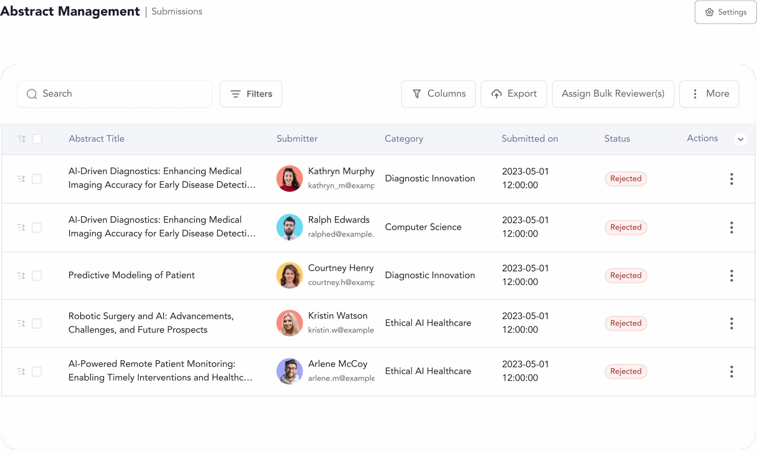 Manage rejected submissions - view details, download PDFs, or edit and delete submissions directly from the actions menu.