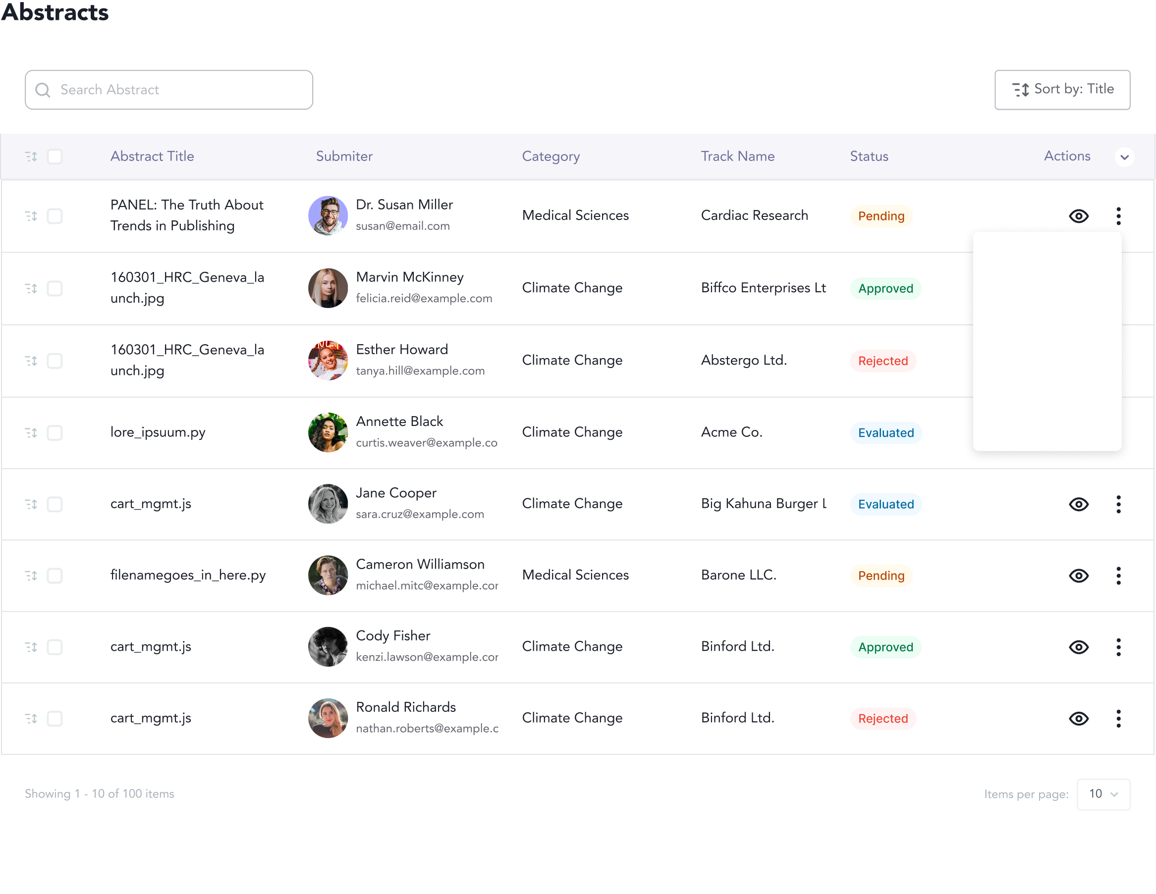 Take action on abstracts - review, evaluate, or accept/reject submissions directly from the 'Actions' menu for each abstract.