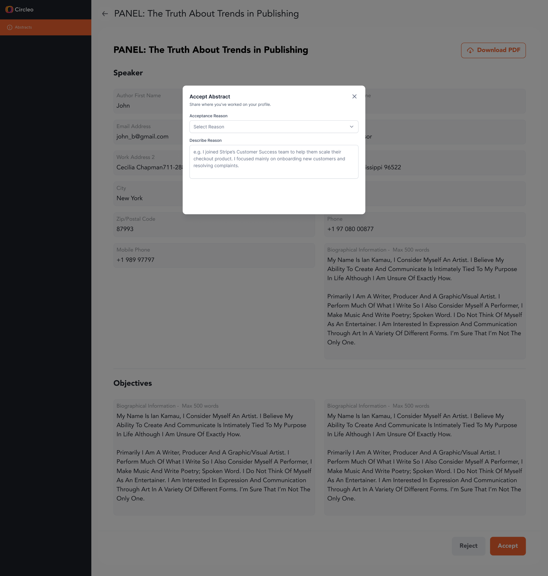 Provide a reason for rejecting the abstract - select from predefined options or add a custom explanation before finalizing your decision.