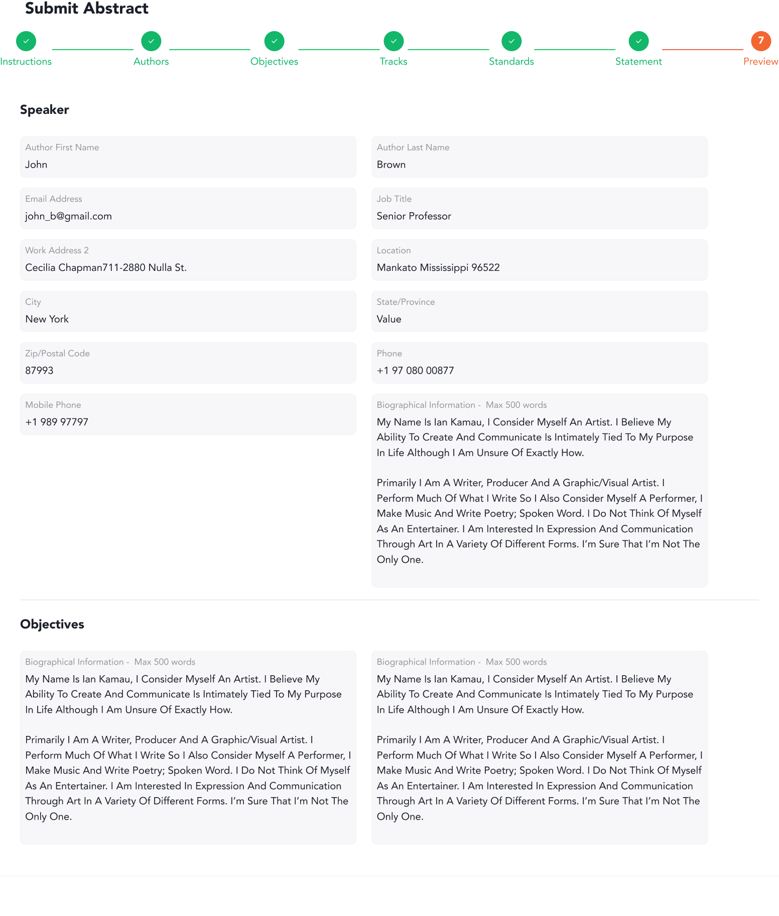 Review and confirm your submission details here - ensure all author information and objectives are correct before finalizing your abstract. Click on continue to save and submit.