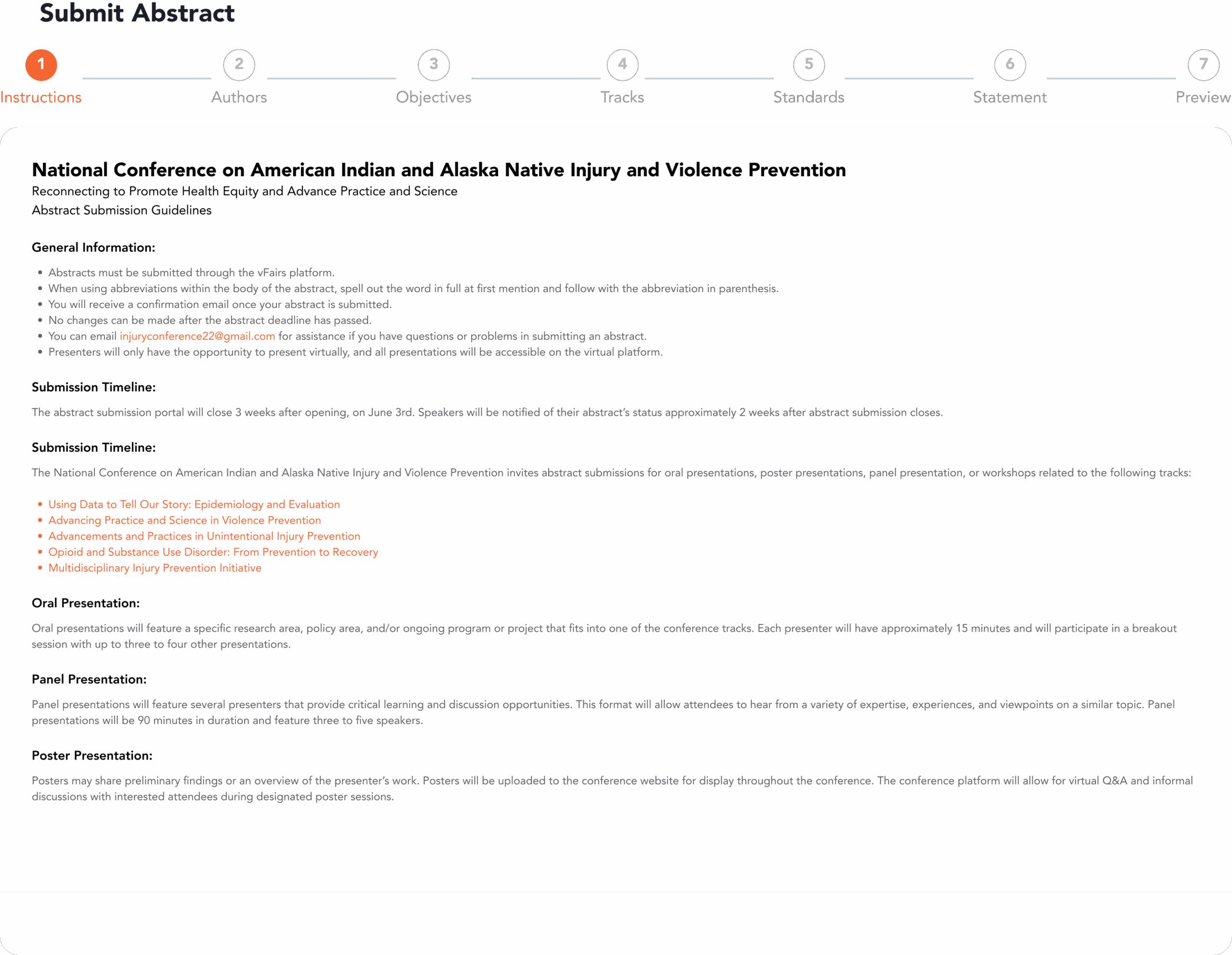 Start your submission journey here. Review the conference guidelines and click ‘Let’s Start’ to begin entering your abstract details.