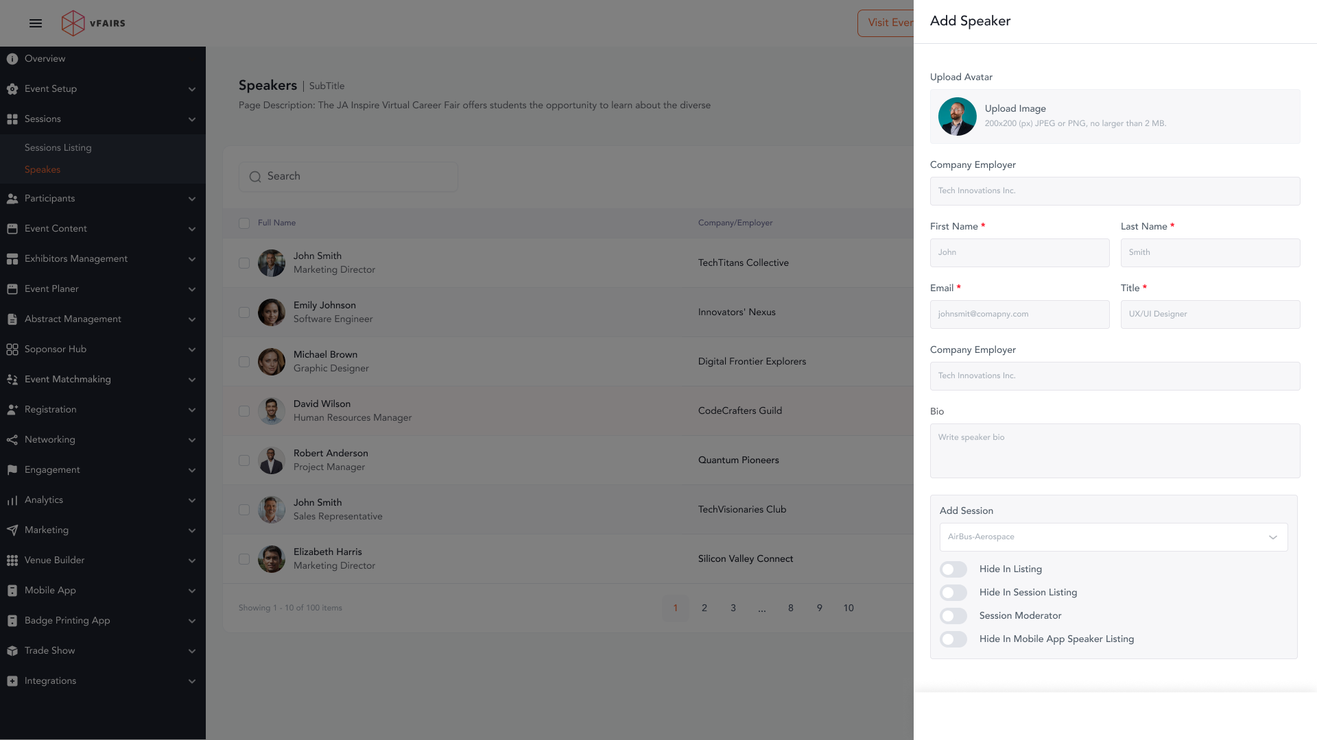 Add speaker details like name, email, title, photo, bio, etc. Manage speaker roles and visibility from here as well.