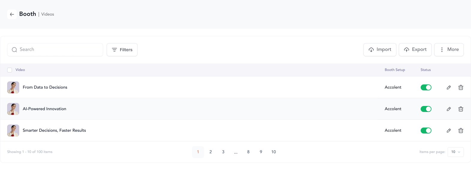 All booth videos are listed here. Add, remove, edit, search, filter, enable or disable videos from here.