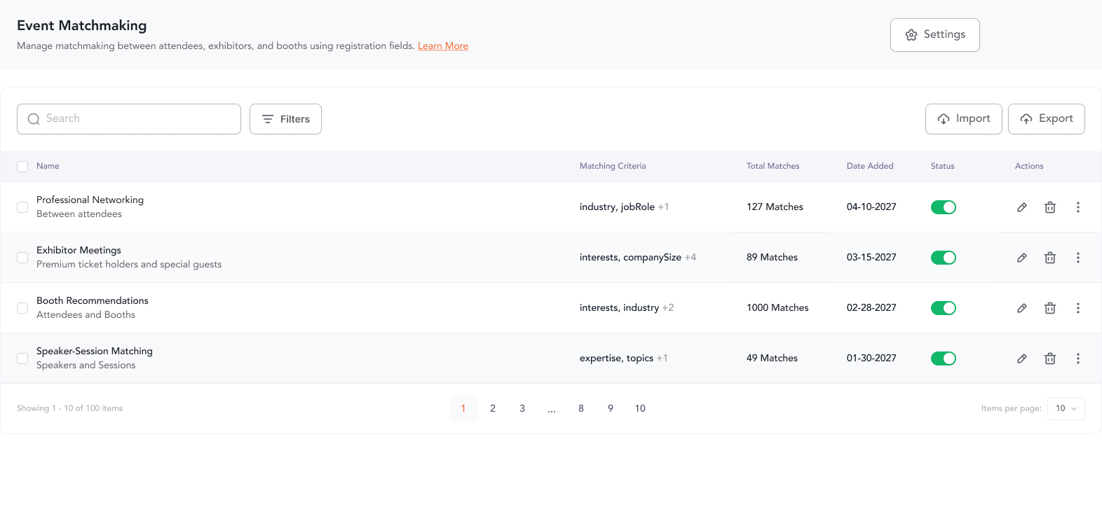 Manage matchmaking between attendees, exhibitors & booths using registration fields. Add, remove, edit, search, enable/disable, import/export matchmaking types easily.